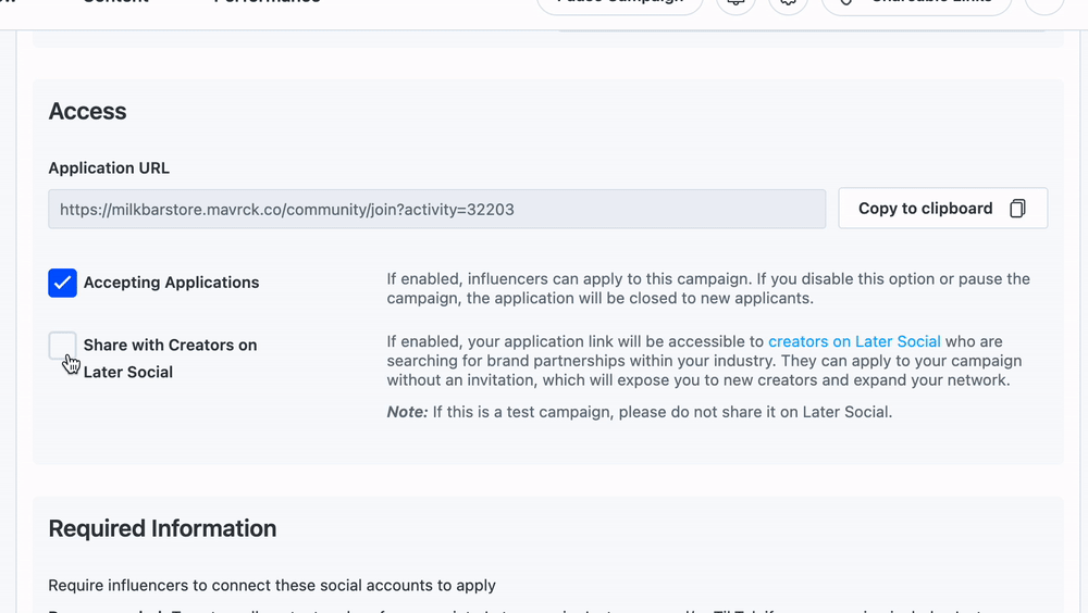 If enabled, your application link will be visible to creators browsing Later Social for brand partnerships in your industry. This allows creators to apply without receiving an invitation — expanding your reach and exposing you to new talent.